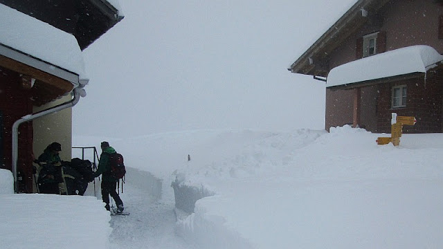 Aber in der Nacht hatte es 70 cm Neuschnee auf der Gummenalp gegeben, und auch während des Tages schneite es weiter. So hatten wir extrem grosse Mühe, eine ganz neue Spur mit den Schneeschuhen zu machen. Im Video sieht man, was passierte.