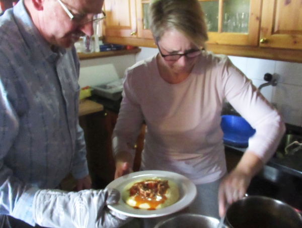 Danach wurde das 3-Gang Menü aufgetischt: Knackiger gemischter Salat, Zigeuner Geschnetzeltes auf feiner rahmiger Polenta umrahmt mit köstlicher Bratensauce. Eine Meringue mit Glacé bildete die Brücke zum Kafi und zu kleinen Leckereien.
